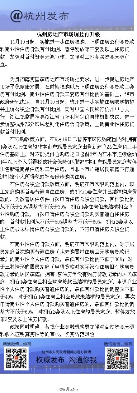杭州深夜發布房地產調控新政 今起上調貸款首付比例(中新網) 發布日期:2016-11-10