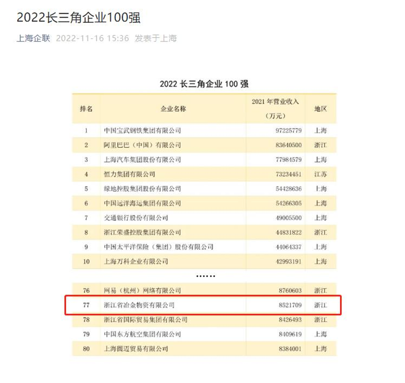 2022長三角企業(yè)百強發(fā)布,本榜單中排名前三的企業(yè)分別是中國寶武鋼鐵集團有限公司、阿里巴巴(中國)有限公司、上海汽車集團股份有限公司。浙江省冶金物資有限公司排名77位。